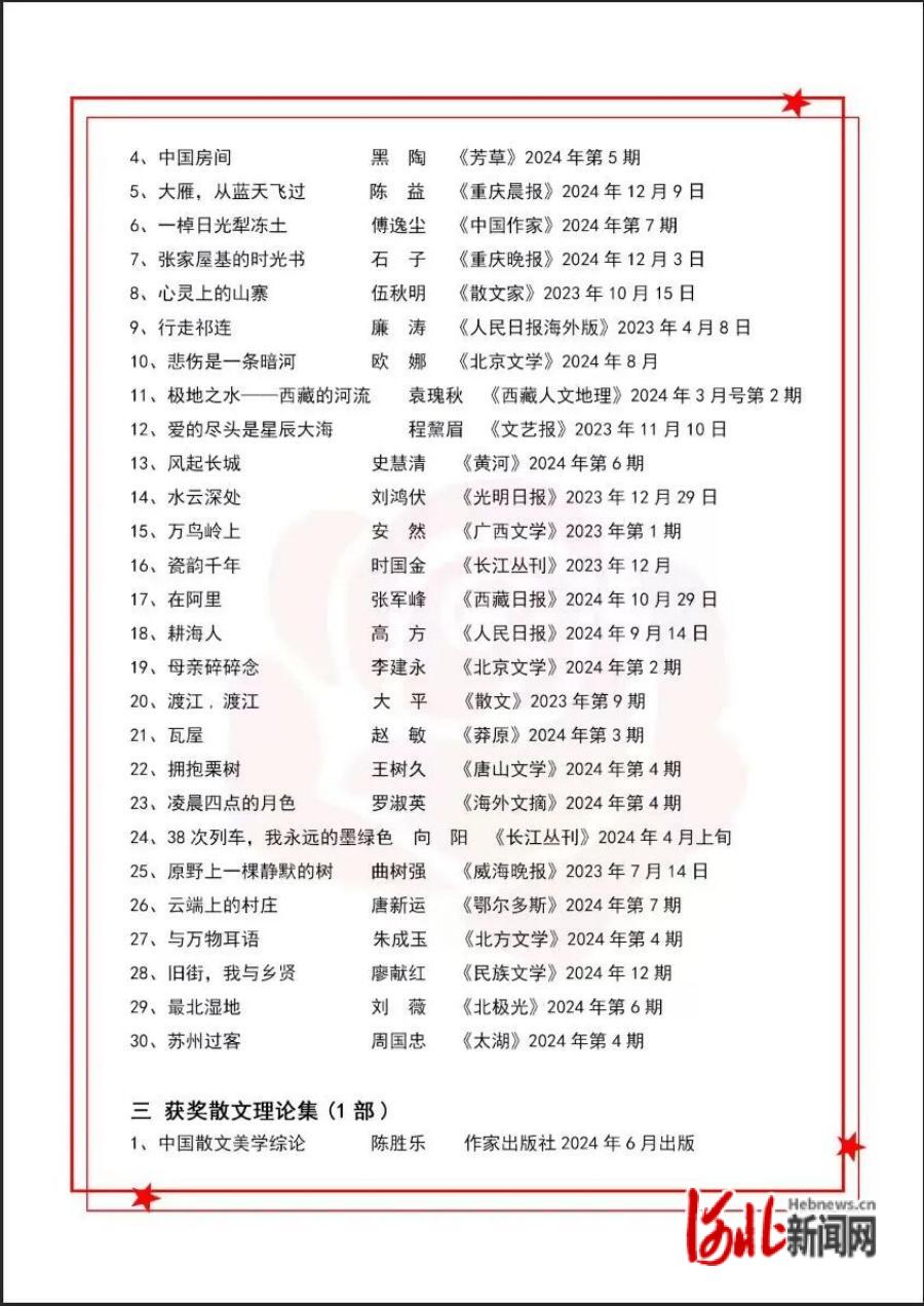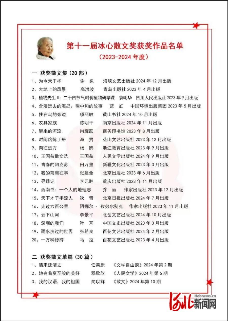 冰心散文奖系中国散文学会根据冰心先生遗愿于2000年创立,与“茅盾文学奖”“鲁迅文学奖”并列的国内文学界重要奖项。该奖多年来持续关注基层作者,特别是年轻作家,为推动各地群众文学创作高质量发展起到了推动作用。冰心散文奖自创立以来,先后有铁凝、贾平凹、蒋子龙、迟子建、肖复兴、赵丽宏、葛水平、周晓枫等作家获此殊荣。