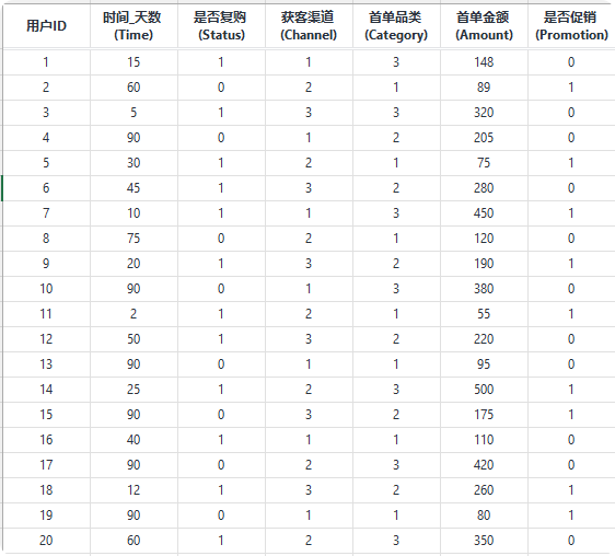 整理源数据表格如下,有4个因子,分别是获客渠道、首单品类、首单金额、是否参与促销,哪个因子才是影响复购的关键因素呢?