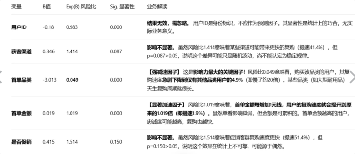 具体可以看表格,sig显著性为0,意味这个因子对复购有深刻的影响关系,首单品类B值为负数,是一个强减速因子,风险比0.049意味着购买该品类,其复购速度急剧下降到仅有其他品类用户的4.9%。归因实际业务场景,这些品类一般是复购周期超长的耐用型品类,比如家电。